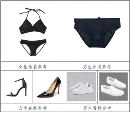 (3)考生按组赤足进行形体形象观测,本组形体形象观测结束后,考生着台步展示考试用鞋(女生着黑色高跟鞋、男生着纯白色板鞋,详见参考图)进行台步展示